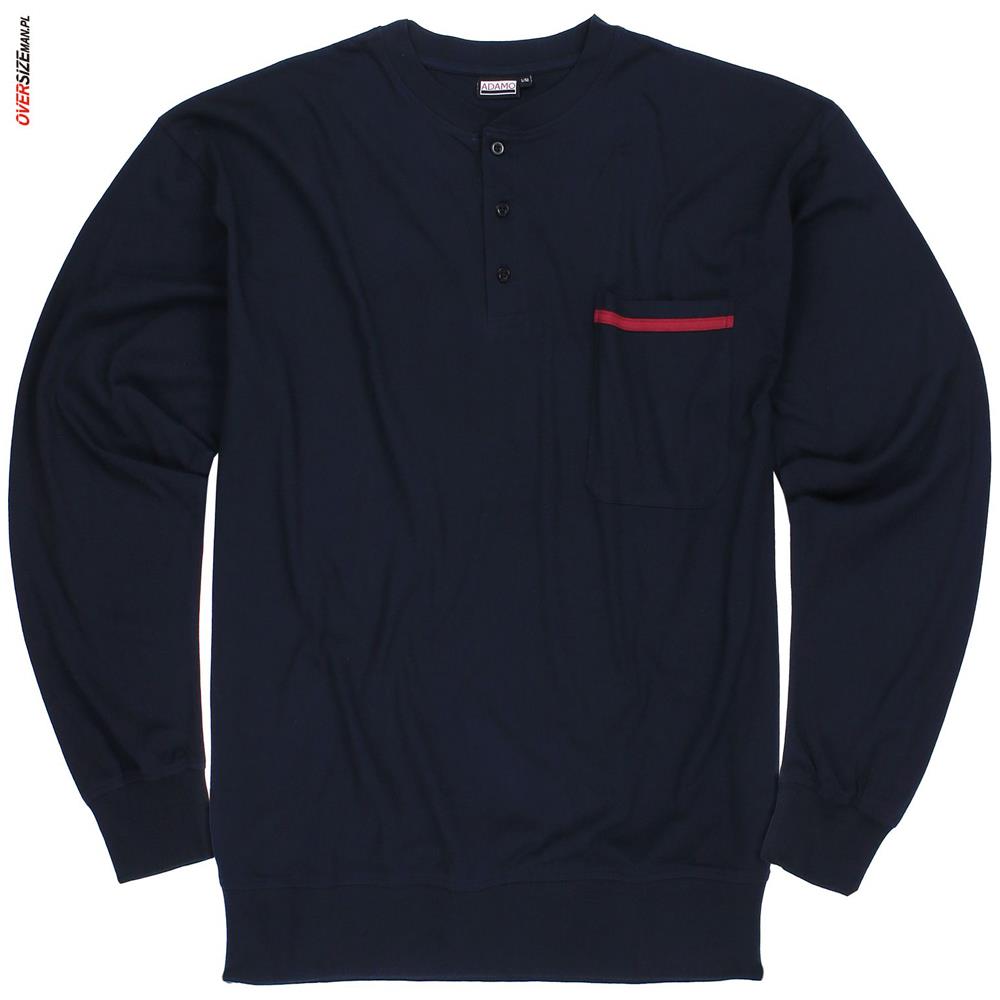 Góra piżamy posiada okrągły dekolt zapinany na guziki (henley), który ułatwia zakładanie i nadaje całości eleganckiego, męskiego charakteru. Na piersi znajduje się praktyczna kieszonka z kontrastowym, czerwonym wykończeniem, stanowiąca subtelny element dekoracyjny. Długie rękawy zakończone mankietami dobrze chronią przed chłodem.