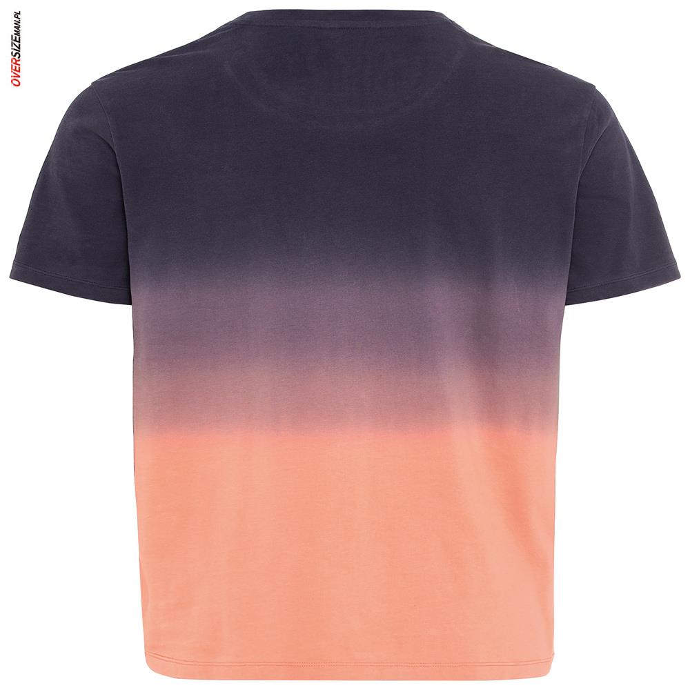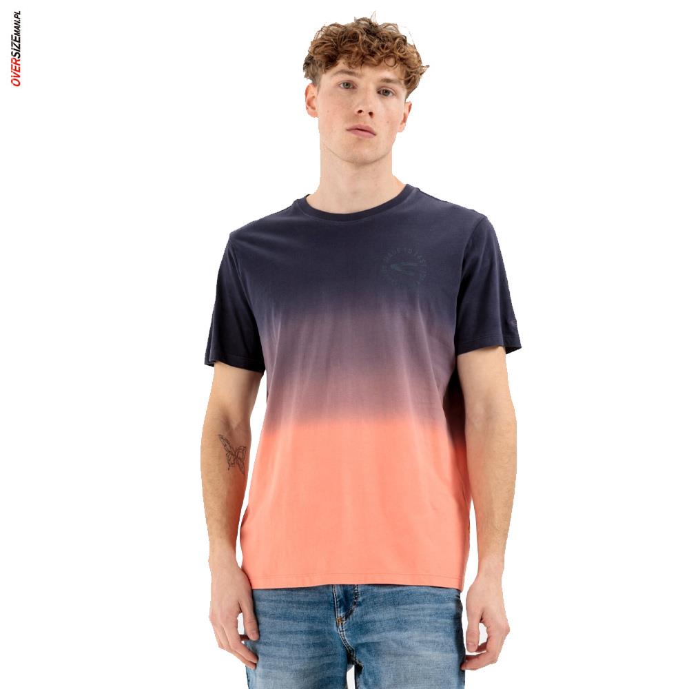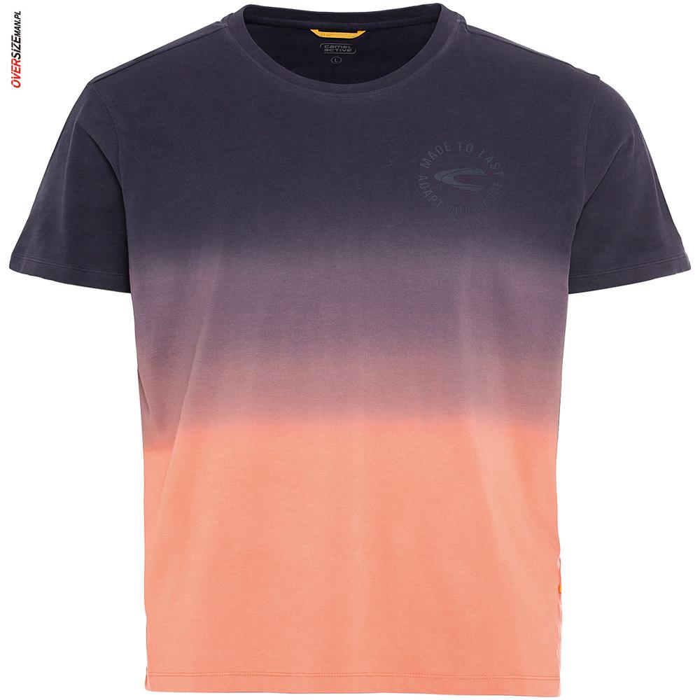 Cieniowany T-shirt niemieckiej marki Camel Active to propozycja dla mężczyzn szukających odzieży męskiej w dużych rozmiarach, łączącej komfort, jakość i nowoczesny wygląd. Model wyróżnia się dwukolorowym przejściem – od ciemnego granatu u góry do koralowego różu na dole – które świetnie komponuje się z jasnymi jeansami i casualowymi stylizacjami.