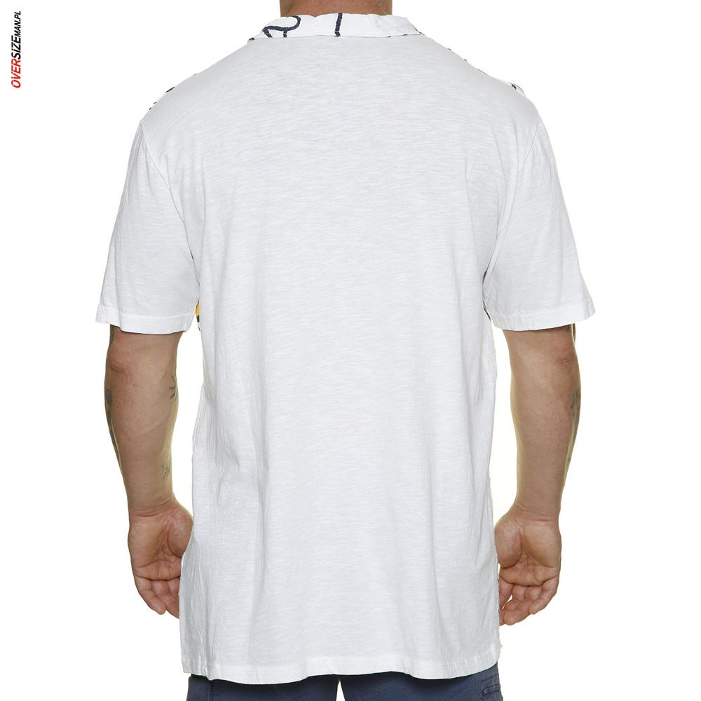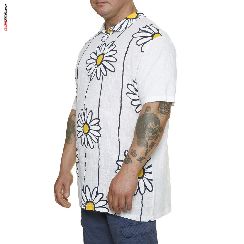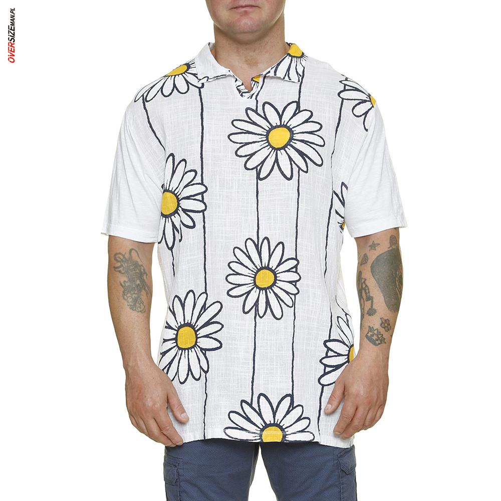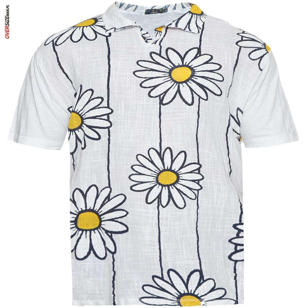 Przód koszulki wykonany jest z czystej, przewiewnej bawełny, natomiast tył i rękawki z dzianiny typu slub z dodatkiem elastanu, co zapewnia wygodę i swobodę ruchów. Stylowy kołnierzyk dodaje elegancji, a duży nadruk z margaretkami oraz subtelne paski nadają koszulce letniego, świeżego charakteru. To idealny element garderoby na ciepłe dni, który można zestawić zarówno z marynarką, jak i casualowymi szortami czy chinosami.