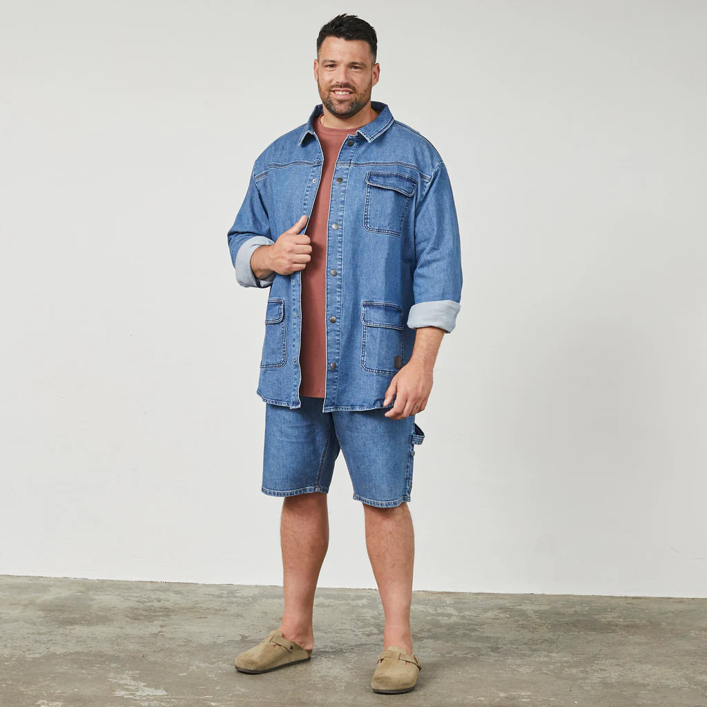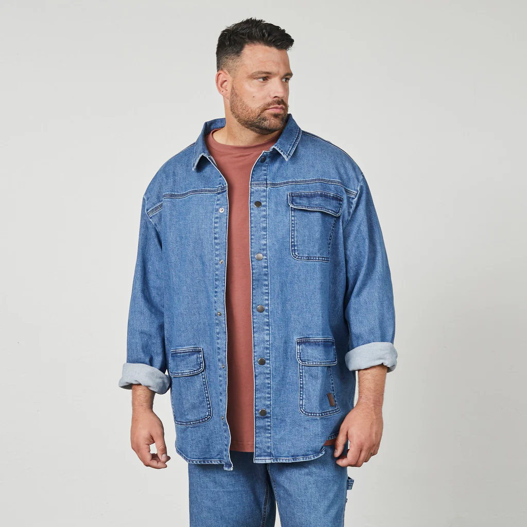Kurtka zapinana jest na guziki na całej długości, co sprawia, że można ją nosić zarówno jako lekką kurtkę, jak i overshirt na t-shirt lub bluzę. Doskonale pasuje do jeansów męskich w dużych rozmiarach lub wygodnych spodni dresowych plus size, tworząc stylowy zestaw na co dzień.