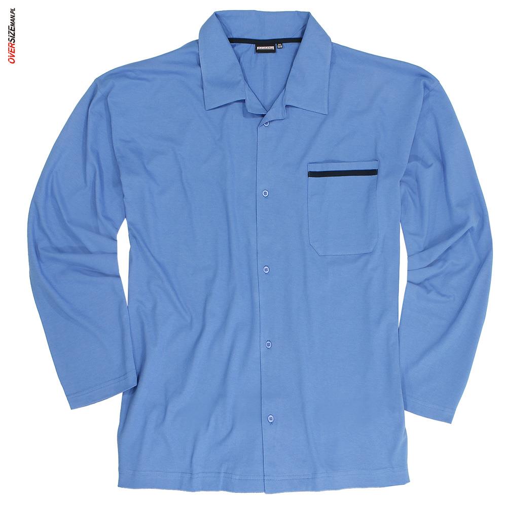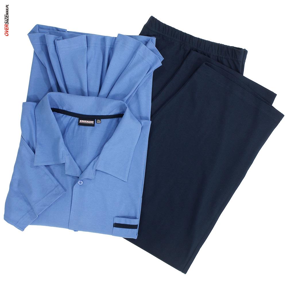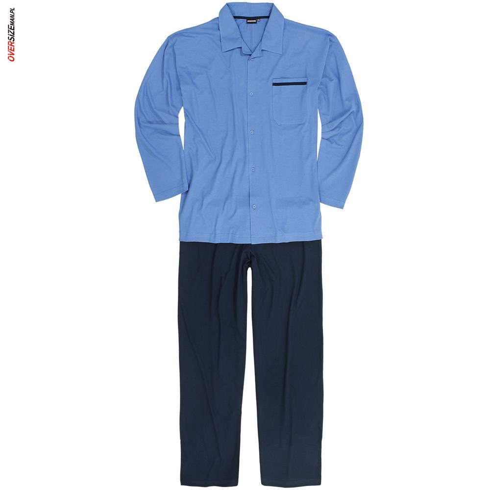 Górna część piżamy w kolorze niebieskim zapinana jest na guziki, co ułatwia zakładanie i zwiększa funkcjonalność modelu. Granatowe spodnie posiadają elastyczną gumę w pasie, dzięki czemu dobrze dopasowują się do sylwetki bez uczucia ucisku. Jeśli szukasz komfortowej odzieży nocnej dopasowanej do większych rozmiarów, warto sprawdzić ofertę, jaką prezentuje sklep z dużą odzieżą męską, gdzie znajdziesz szeroki wybór wygodnych modeli.